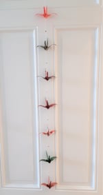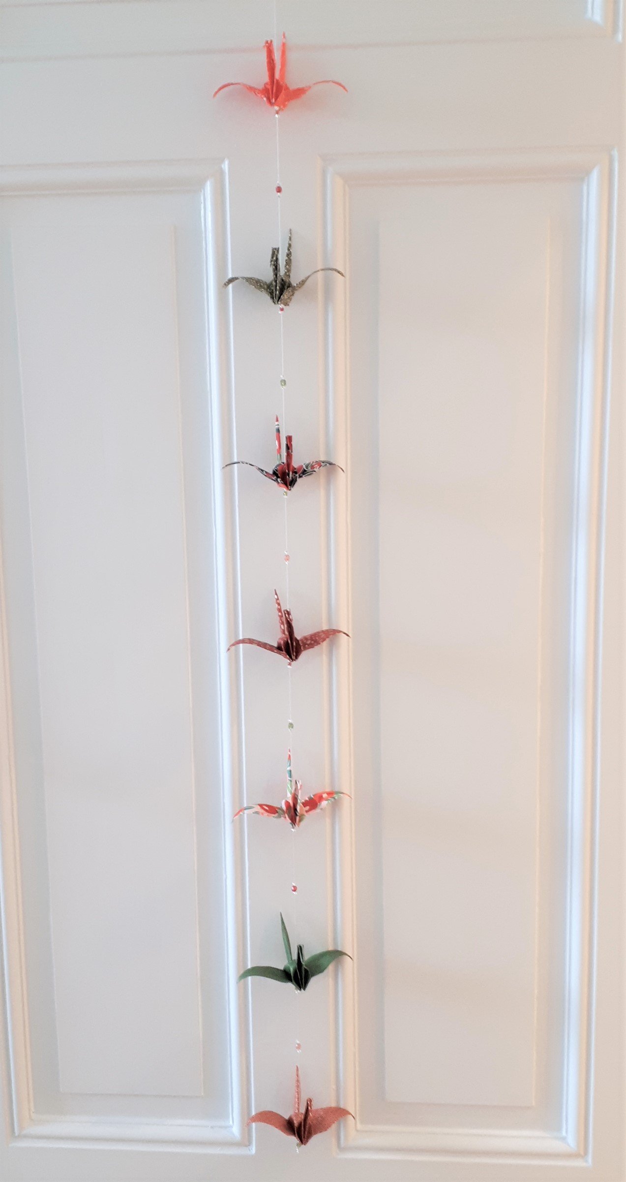 Guirlande perlée de 7 grues, en pliage origami de papier washi japonais.